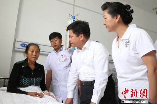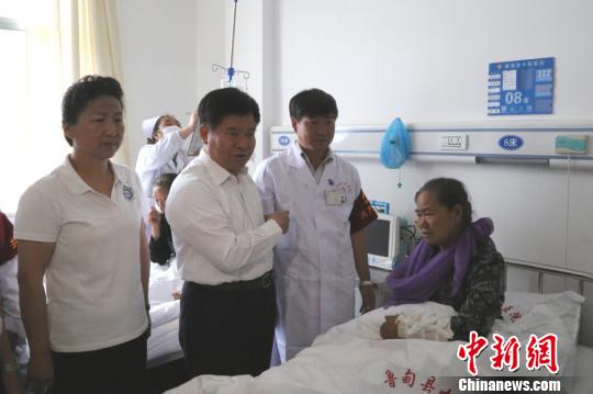李纪恒在鲁甸中医院看望慰问龙头山镇龙泉村伤员欧明英。 李智 摄