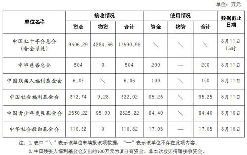 截至8月11日17时,中国红十字会总会和5家在民政部登记的社会组织向民政部报送了救灾捐赠款物统计数据,中国红十字会总会接受云南鲁甸地震捐赠款物超1.35亿,具体情况见表。