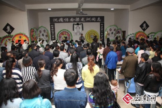 8月13日,牺牲在抗震救灾第一线的梁龙洲同志追悼会在鲁甸县茨院乡昆华化工礼堂举行,梁龙洲的亲属、生前好友、同事、自发组织的市民600余人来到现场,送梁龙洲最后一程。