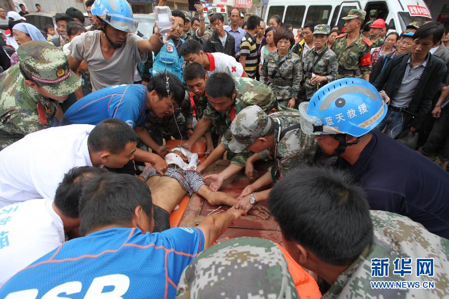 8月14日,在云南省巧家县包谷垴乡,医务人员对坠落的挖掘机司机刘志全进行抢救。当日,来自四川宁南县的28岁挖掘机司机刘志全在云南鲁甸地震灾区的堰塞湖保通工作中,从60米高处连同挖掘机一起翻落坠下。事故发生后,伤者被送往巧家县医院进行急救。目前,刘志全的伤情危重,现正在手术中。新华社发(张广玉 摄)