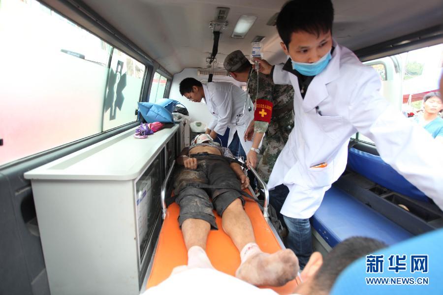 8月14日,在云南省巧家县包谷垴乡,医务人员将坠落的挖掘机司机刘志全抬上救护车。当日,来自四川宁南县的28岁挖掘机司机刘志全在云南鲁甸地震灾区的堰塞湖保通工作中,从60米高处连同挖掘机一起翻落坠下。事故发生后,伤者被送往巧家县医院进行急救。目前,刘志全的伤情危重,现正在手术中。新华社发(张广玉 摄)