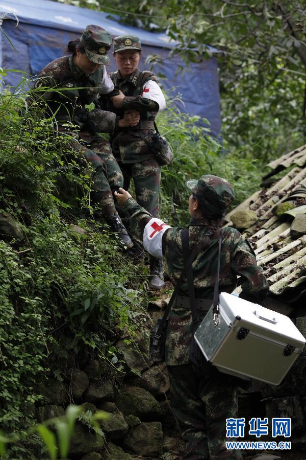 8月14日,在云南省巧家县包谷垴乡红箐村,第二炮兵抗震救灾部队533医院医疗队女兵“突击组”徒步进入重灾区开展救援工作。新华社发(张广玉 摄)
