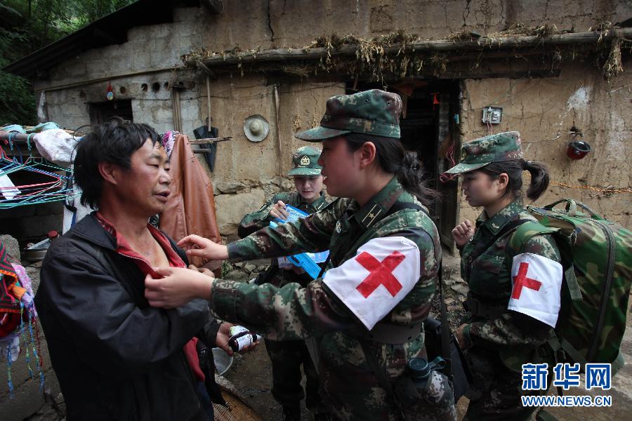 8月14日,在云南省巧家县包谷垴乡红箐村,第二炮兵抗震救灾部队533医院医疗队女兵“突击组”为村民看病。新华社发(张广玉 摄)