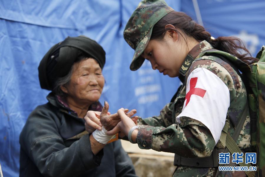 8月14日,在云南省巧家县包谷垴乡红箐村,第二炮兵抗震救灾部队533医院医疗队女兵“突击组”开展救援工作。新华社发(张广玉 摄)