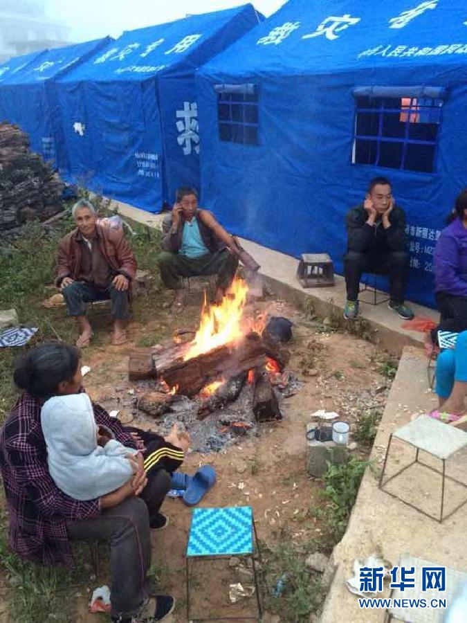 10月8日,一些当地群众在云南省景谷县永平镇芒费村的救灾帐篷前休息(手机拍摄)。