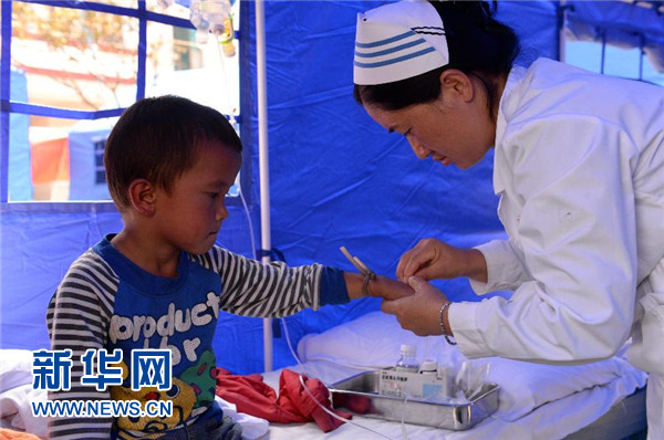 10月8日,在景谷县第二人民医院,医护人员在给一名孩子打针。 新华社记者 胡超 摄