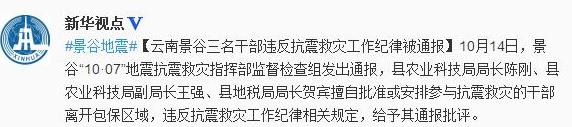 人民网北京10月17日电 据新华社新华视点微博消息,10月14日,景谷“10·07”地震抗震救灾指挥部监督检查组发出通报,县农业科技局局长陈刚、县农业科技局副局长王强、县地税局局长贺宾擅自批准或安排参与抗震救灾的干部离开包保区域,违反抗震救灾工作纪律相关规定,给予其通报批评。