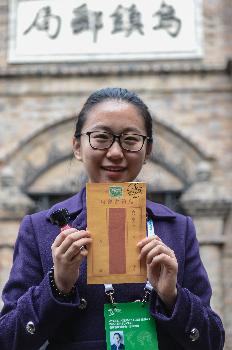 11月19日,乌镇邮局的工作人员在展示加盖了“互联生活”纪念戳的纪念封。