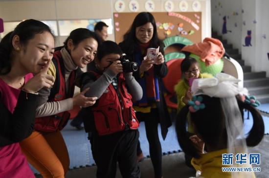2014年12月31日,志愿者带着一名自闭症儿童(左三)体验摄影记者的职业。