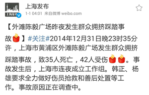 人民网北京1月1日电 据上海市政府新闻办公室官方微博“@上海发布”消息,2014年12月31日晚23时35分许,上海市黄浦区外滩陈毅广场发生群众拥挤踩踏事故,致35人死亡,42人受伤。