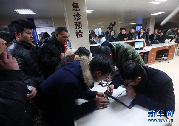 2015年1月1日凌晨,踩踏事故伤者亲友在上海市第一人民医院内登记个人信息。