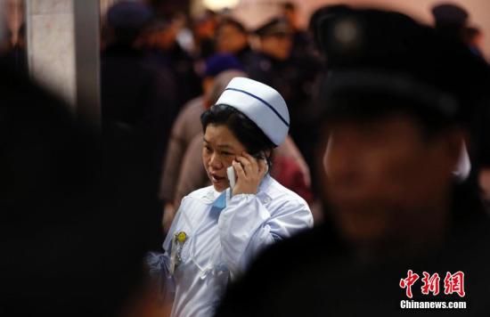 2015年1月1日上午,在上海第一人民医院急诊室外等候消息的家属悲痛欲绝。2014年12月31日晚23时35分许,上海外滩陈毅广场发生拥挤踩踏事故,致35人死亡,42人受伤。事故发生后,上海市连夜成立工作组,事故原因目前正在调查中。图为第一人民医院急诊室戒备森严。汤彦俊 摄