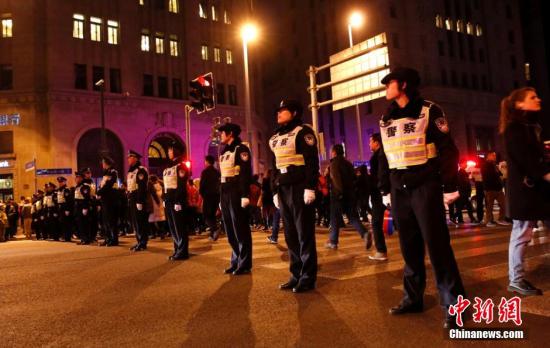 2015年1月1日晚,上海警方加强外滩安保工作。2014年12月31日晚23时35分许,上海外滩陈毅广场发生拥挤踩踏事故,截止目前,致36人死亡,47人受伤。汤彦俊 摄