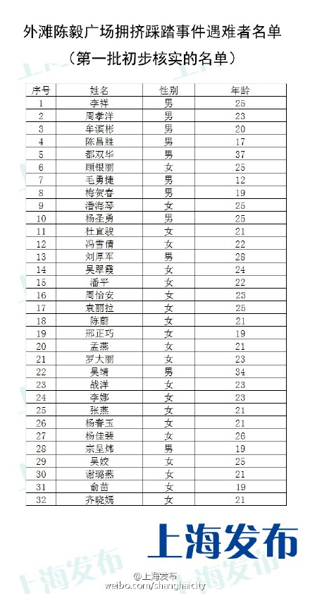 上海外滩拥挤踩踏事件首批32位遇难者名单公布