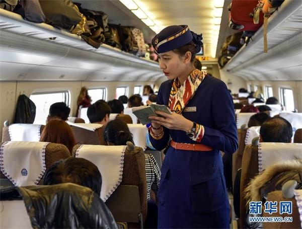 2月4日,担任首趟出疆高铁春运任务的D2702次动车从乌鲁木齐南站始发开往兰州,“动姐”代丹在列车上核对乘客的票务信息。这是代丹第一次承担动车组的春运任务。身高174厘米的代丹曾是一名模特,之后成为乌鲁木齐客运段的乘务员。2014年底兰新高铁开通后,代丹成为了动车组的乘务员。