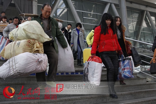 在火车站出站口,家住界首的小伙子杨磊只背了一个电脑包回来,“有了电脑,过年时可以看电影玩游戏”。