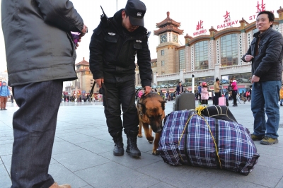 昨天,北京站广场,警犬在训导员的指挥下对大件行李进行搜查。京华时报记者徐晓帆摄