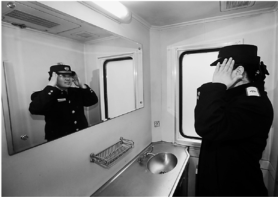 列车正式出发前,王智慧在盥洗室整理自己的衣帽
