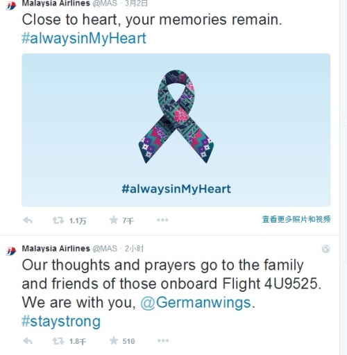 马航发表推文支持“德国之翼” 为机上人员祈祷