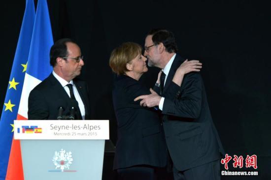 资料图:法国总统奥朗德、德国总理默克尔和西班牙首相拉霍伊25日在法国上普罗旺斯阿尔卑斯省小镇塞讷视察A320客机空难搜救工作后共同与记者见面。图为默克尔(中)和拉霍伊(右)在记者会上拥抱。 龙剑武 摄