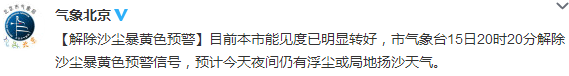 中新网4月15日电 据北京市气象局官方微博“气象北京”消息,目前北京能见度已明显转好。北京市气象台20时20分解除沙尘暴黄色预警信号,预计今天夜间仍有浮尘或局地扬沙天气。