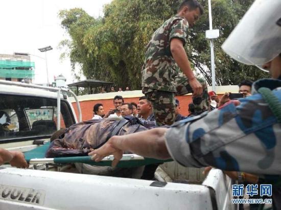 4月25日,在尼泊尔加德满都市中心,人们将一具遇难者遗体抬上汽车。 新华社记者 周盛平 摄 图片来源:新华网