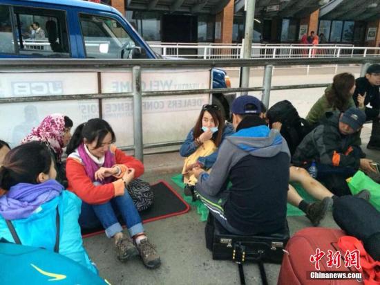 4月25日14时11分在尼泊尔(北纬28.2度,东经84.7度)发生8.1级地震,首都加德满都机场因地震暂时关闭,部分中国游客在机场滞留等待回国。中国驻尼泊尔大使馆人员正在现场安抚。中新社发李滟竹 摄