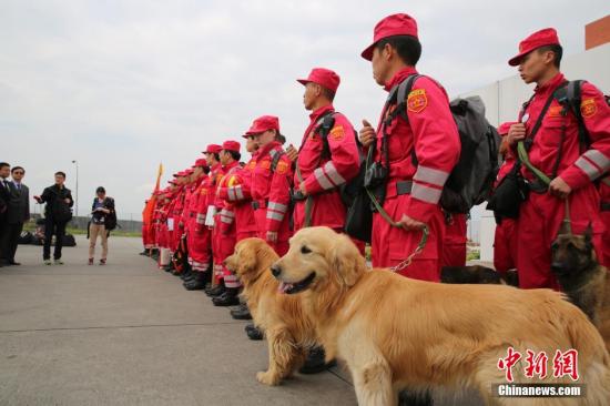 当地时间4月26日上午,中国国际救援队在尼泊尔地震发生24小时之内飞抵加德满都。中方救援队一行69人,携带6只搜救犬及医疗器械,落地后随即开展救援工作。图为中国国际救援队。中新社发符永康 摄