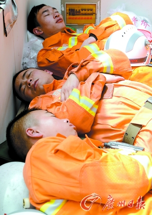 救援队员们累极了,靠着墙睡着了。 新华社发