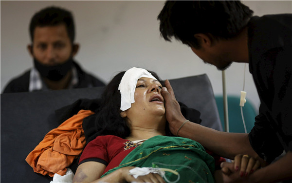 ↑4月26日,在尼泊尔首都加德满都,一名男子安慰在地震中受伤的母亲。新华社/路透