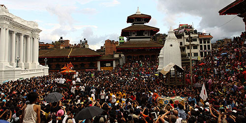 ↑2013年9月23日在尼泊尔加德满都拍摄的杜巴广场举行庆典活动的照片。