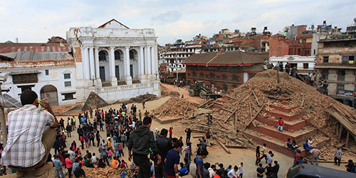 4月25日当地时间14时11分,在尼泊尔发生的8.1级地震导致加德满都世界文化遗产杜巴广场上的建筑大部分倒塌。
