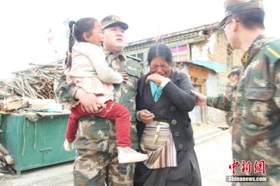 4月25日,西藏公安边防总队侦查支队官兵在吉隆镇安抚受灾群众。中新社发 杨鸿辉 摄 摄