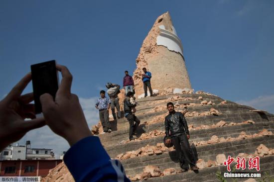 图为民众在达拉哈拉塔前拍照留念。这座曾经的9层高塔被地震彻底损坏,如今只剩下废墟。
