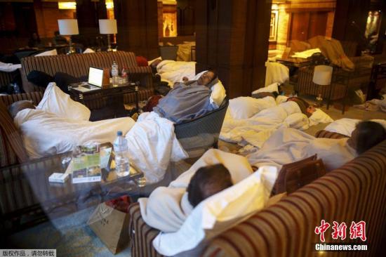 当地时间4月27日,尼泊尔首都加德满都的一家豪华酒店内,躲避地震的旅客挤在客房里睡觉。