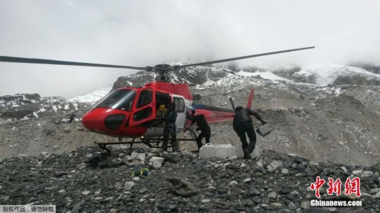 当地时间4月27日,一架救援直升机降落在珠峰高处的一处营地,将因雪崩而受困的登山者转移至珠峰大本营。尼泊尔25日发生8.1级地震,地震造成珠穆朗玛峰发生雪崩,珠峰两个营地被雪覆盖,多名登山者失去联系。