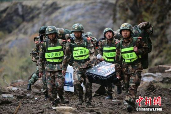 4月28日,西藏日喀则,西藏公安边防总队聂拉木边检站与聂拉木边防大队组建25人抢险救援队伍通过友谊隧道徒步挺进与外界失联70小时的“孤岛”樟木镇。