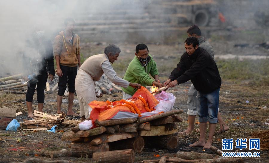 4月29日,在尼泊尔首都加德满都,亲属为地震遇难者进行火葬仪式。尼泊尔4月25日发生的强烈地震已导致5000余人死亡,目前死亡人数仍在上升。 新华社记者秦晴摄