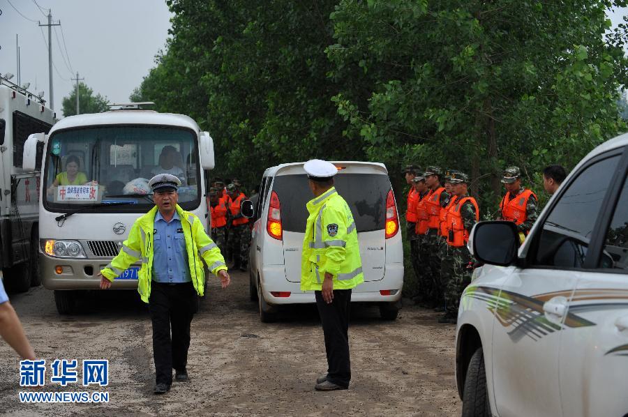6月2日,一名警察在为救援车辆引路。 6月1日晚,从南京驶往重庆的客船“东方之星”轮在长江中游湖北监利水域发生翻沉。据最新初步统计,事发客船共有456人,其中旅客405人。在搜救现场外围,工作人员疏通道路交通,保障救援车辆通行。新华社记者 梁相斌 摄