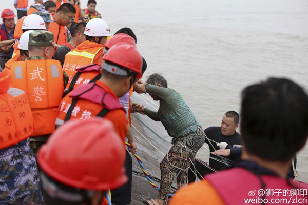 6月2日中午12时52分,在湖北监利长江客轮事件现场,一位老太太被潜水员救出。