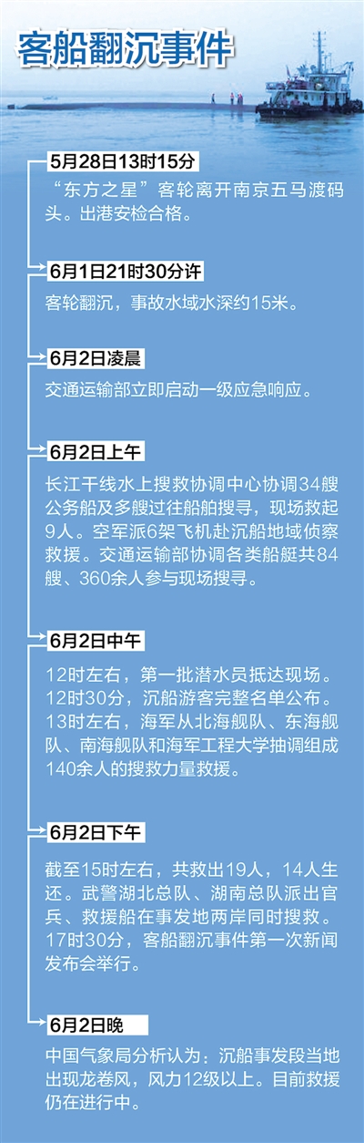 6月1日21时30分许,重庆东方轮船公司所属旅游客船“东方之星”号在由南京驶往重庆途中,上行至长江水域湖北监利县大马洲水道44号过河标水域处,突遇龙卷风翻沉。6月2日1时许,长江干线水上搜救协调中心接报。记者在救援现场获悉:截至2日19时,已经找到20人,其中14人生还,6人遇难。目前救援工作正在争分夺秒进行中。