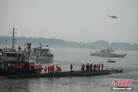 6月2日下午,湖北监利沉船地点,救援人员在倾覆的客船附近继续进行搜救。6月1日21时30分许,重庆东方轮船公司所属旅游客船“东方之星”轮在由南京驶往重庆途中,突遇龙卷风发生翻沉。据初步统计,事发客船共有458人,其中旅客406人。 中新社发 张晟光 摄