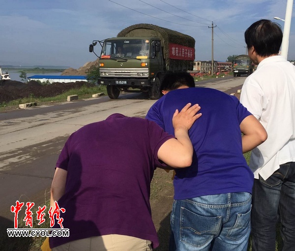 遇难者家属在江边祭拜,碰到参与救援的湖北省军区某舟桥旅撤离,家属面对车队鞠躬感谢。中国青年报·中青在线记者刘世昕摄