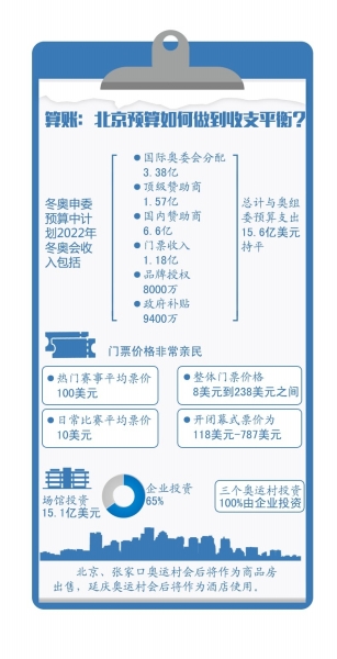 上届索契冬奥会开支为500亿美元。昨天,北京冬奥申委财务及市场开发部副部长周星公布了预算数据,其中2022年冬奥会编制的预算规模为15.6亿美元,政府补贴占6%;非组委会预算场馆资本投资总额15.1亿美元,将大量引入社会资本。未来北京若举办2022年冬奥会将做到收支平衡。