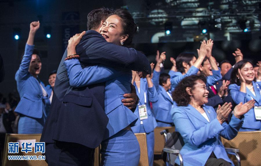 7月31日,北京申冬奥代表团成员申雪、赵宏博夫妇拥抱庆祝。当日,在国际奥委会第128次全会上,北京携手张家口获得2022年冬奥会举办权。新华社记者吕小炜摄