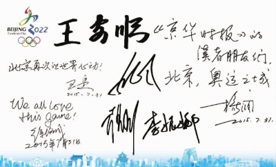 昨晚,北京取得2022年冬奥会举办权后,北京冬奥申委主席、北京市市长王安顺,冬奥申委总策部副部长杨澜,北京申冬奥形象大使、著名篮球运动员姚明,北京申冬奥形象大使、自由式滑雪空中技巧世界冠军李妮娜,北京冬奥申委新闻宣传部部长王惠,北京冬奥申委新闻宣传部副部长徐济成,场馆规划处副处长张利等7位北京申冬奥代表团成员通过《京华时报》表达申冬奥成功后的喜悦之情,并签名留念。