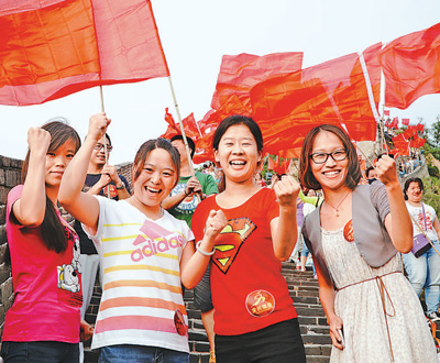 7月31日,北京延庆县群众在八达岭长城上挥舞红旗,欢呼申冬奥成功。 本报记者 贺勇摄
