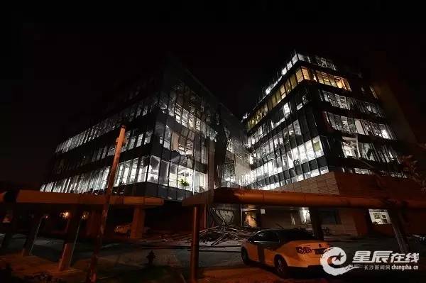 (今日凌晨2时许,在距离天津滨海新区天津港爆炸点约一公里的地方,这栋办公楼的窗户全部震毁。长沙晚报星辰在线特派记者石祯专、陈焕明摄影报道)