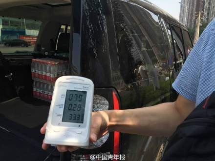 志愿者王晓磊在事发两公里左右的路口检测空气质量指数正常。pm2.5、挥发性有机物都是平时水平。(张国)