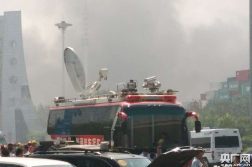 目前在事故现场依然有浓烟升起,在刚刚,有15辆消防车开进天津港,这些消防车上都写了“泡沫车”。危化品如果发生火灾,不能用水来浇灭,只能用泡沫。另外,现在在天津港口还有三辆消防泡沫车正在等待进入。同时在另一条车道上还有8辆载重车,载重车上装的都是沙土。危化品发生火灾时,常用的一个方法就是用沙土里掩盖。